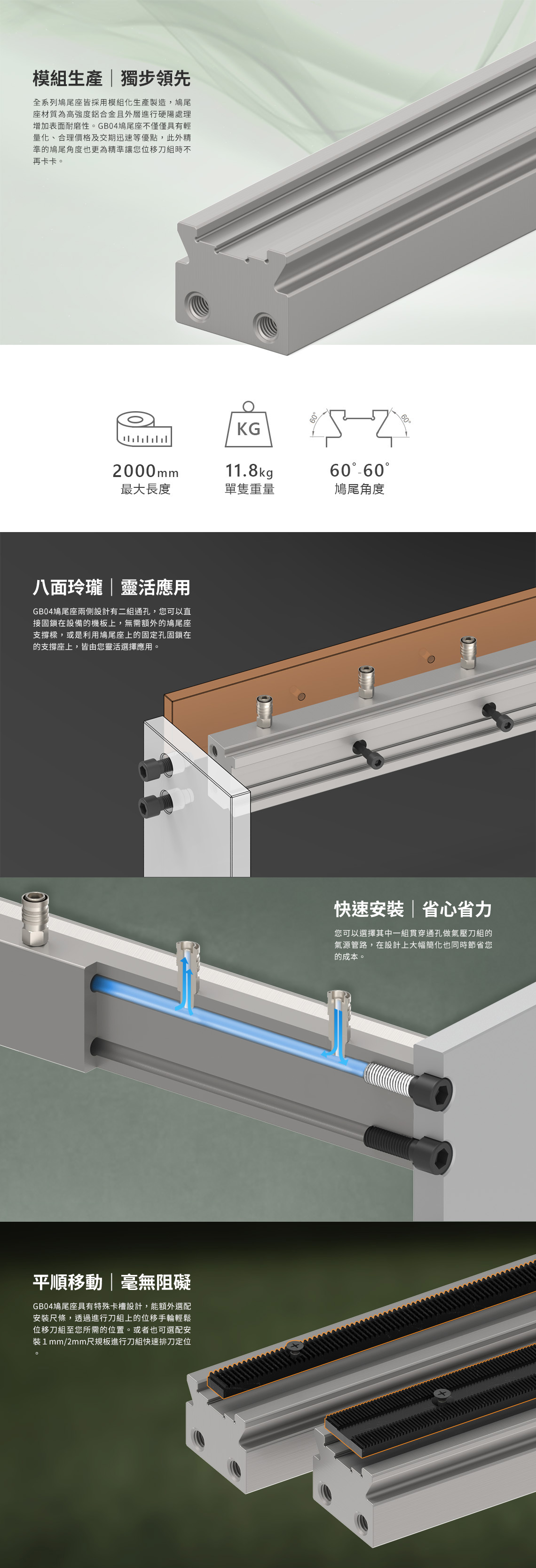 GB04 複合型鳩尾座用於輕負荷及安裝少量 刀組應用場合,鳩尾座側邊有二組通孔可 同時做為固定鳩尾座及供氣管路所使用。